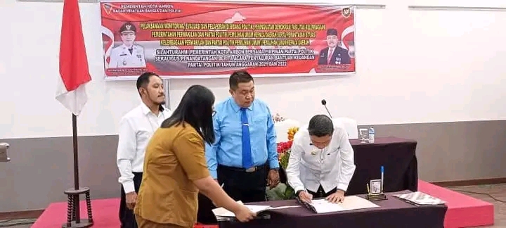Penjabat Walikota Ambon Bodewin Wattimena dan Sekretaris Kota (Sekkot) Agus Ririmasse bersama pimpinan 11 Parpol tersebut pun menandatangani berita acara penyaluran dana di salah satu hotel di kota Ambon, Selasa (23/8).