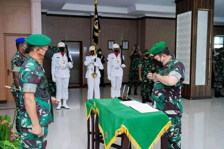 Brigjen TNI Asep Abdurachman kemudian mengisi buku korps raport dan penciuman pataka Kodam XVI/ Pattimura dilanjutkan penyematan tanda jabatan disaksikan Pangdam.