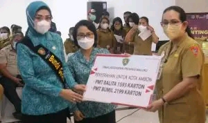 Selanjutnya Dinas Kesehatan Provinsi memberi bantuan pemberian makanan tambahan (PMT) Balita sebanyak 1593 karton dan PMT Ibu Hamil 2199 karton yang diterima Kadis Kesehatan Kota Ambon Wendy Pelupessy, untuk nantinya diteruskan ke 22 Puskesmas.