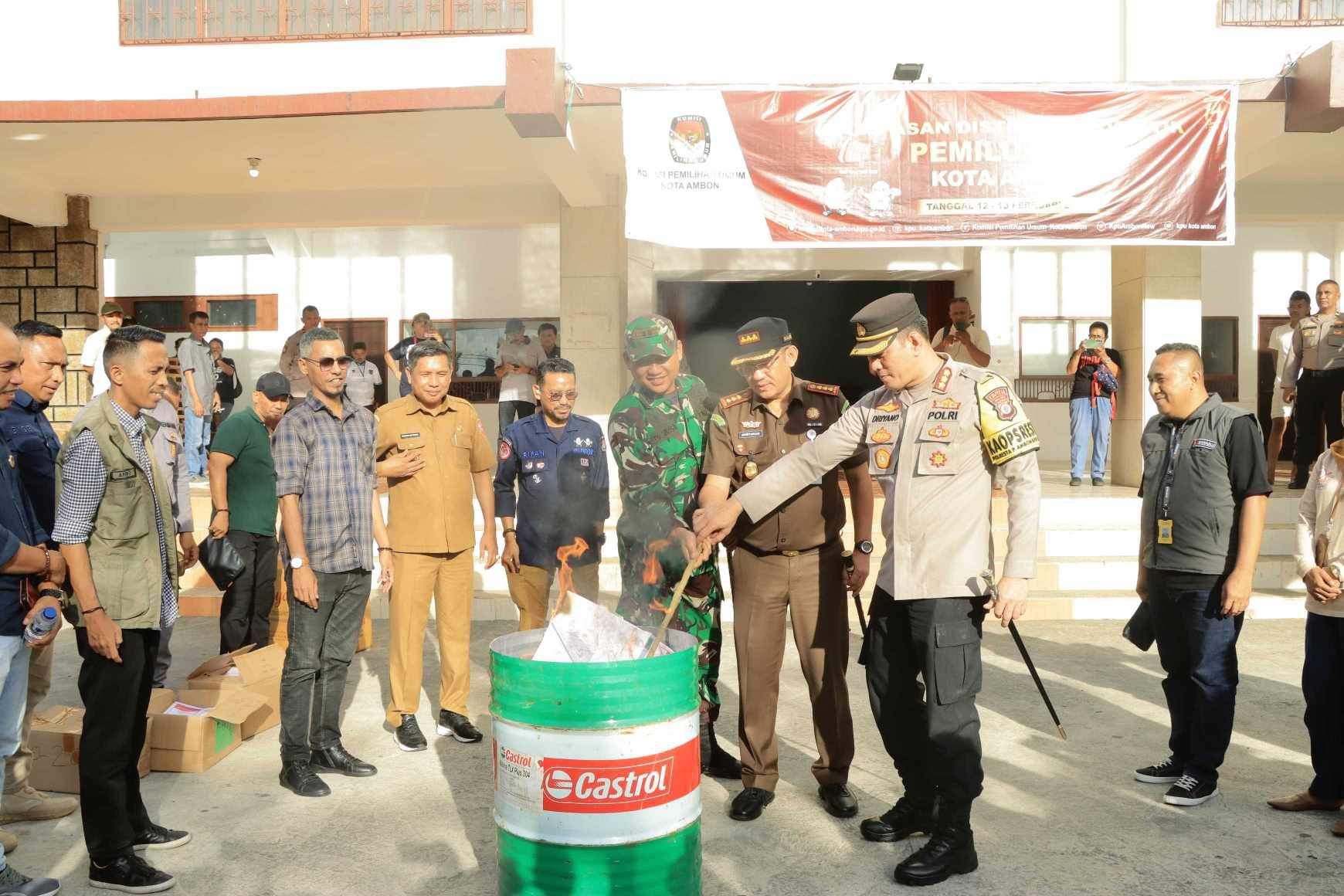 AMBON,TABAOSNews.com.- KPU Kota Ambon melakukan pemusnahan kertas suara rusak yang disaksikan, Kapolresta Pulau Ambon dan Pp Lease, Kombes Pol Driyano Andri Ibrahim, Pj Waalikota Ambon, Bodewin Wattimena, Dandim 1504/Ambon Letkol Inf. Leo Octavianus M. Sinaga, Kajari Ambon Adhryansa, Ketua Bawaslu Provinsi Subair, Ketua KPU Kota Ambon M. Seddek Fuad, Ketua Bawaslu Kota Ambon Albert. J. Talabessy, Kordif KPU Kordif Teknis KPU Rudi Layn, Kordif P3S Bawaslu Kota Ambon Suminar Sehuwakim. Pemusnahan dipusatkan di Sporthall Karang Panjang Ambon dengan cara dibakar di halaman depan gedung Sport Hall Ambon, Selasa (13/2).