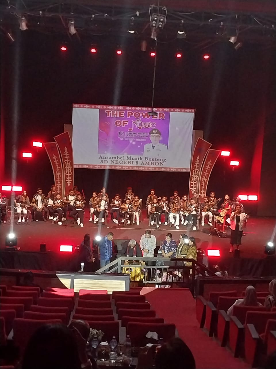 AMBON,TABAOSNews.Com.- Walikota Ambon, Bodewin Wattimena memberikan apresiasi kepada Sanggar Ansambel Music Benteng di bawah pimpinan Stevy Sahetapy yang berkolaborasi dengan SD Negeri 8 Ambon dalam konser Amal ‘The Power of Music yang digelar di Gedung Theater Paulus Peea Taman Budaya, Karang Panjang Ambon dengan menghadirkan bintang tamu diantaranya Putri Pasanea dan Yopi Paliama serta Vilia Sahetapy sekaligus penandatanganan prasasti Monumen Musik SD Negeri 8 Ambon.